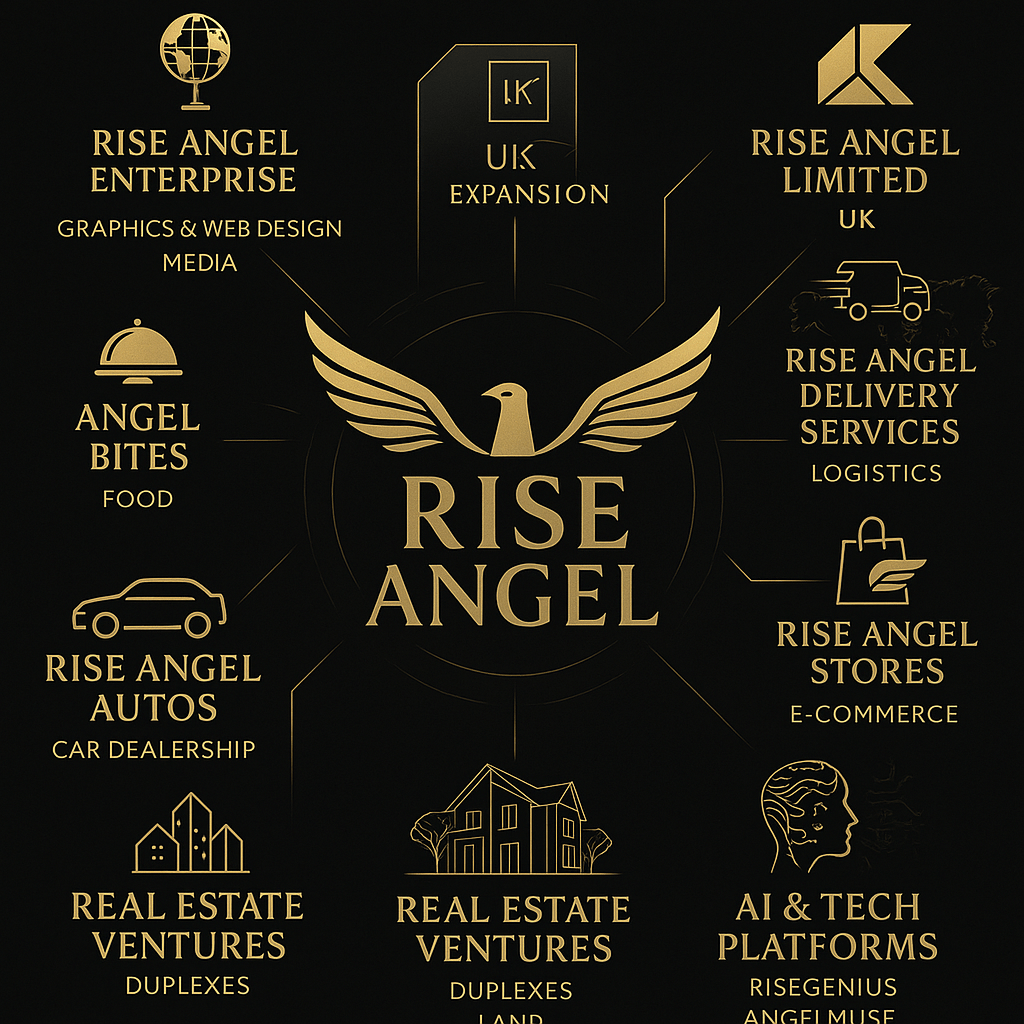 - Technology & Enterprise: Our focus is not just on digital presence but on true transformation. We are advancing proprietary AI platforms, including RISENIUS and ANGELMUSE, alongside critical infrastructure for Africa—spanning Rise Angel Autos, Delivery Logistics, E-commerce Retail, and extensive Real Estate Ventures.[1]