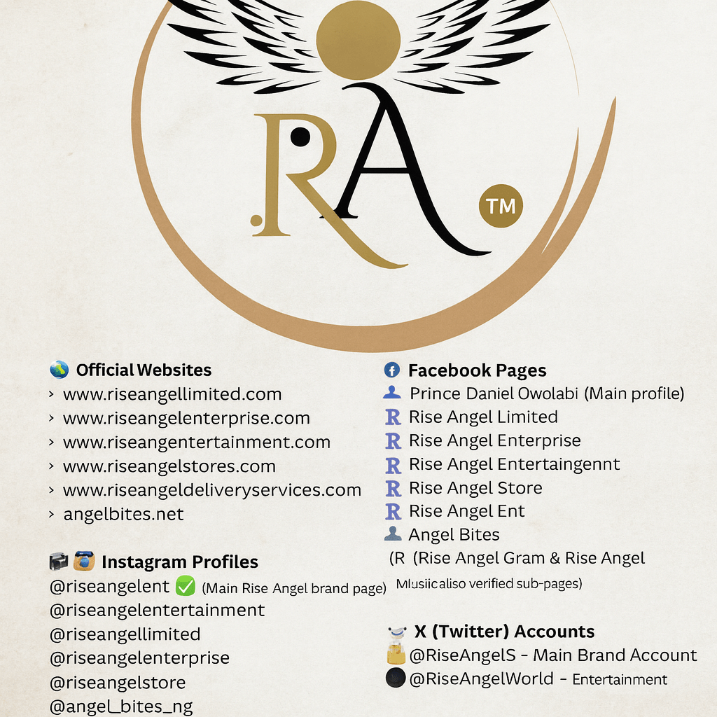 The Rise Angel Group is a diversified creative enterprise and global ecosystem founded by Prince Daniel Owolabi (Rise Angel), Founder & CEO, and Joy Angel Thorne, Co-Founder & Strategic Director.